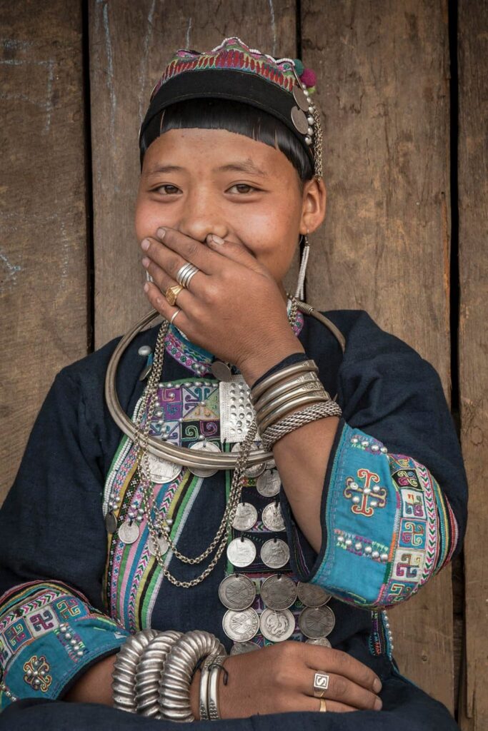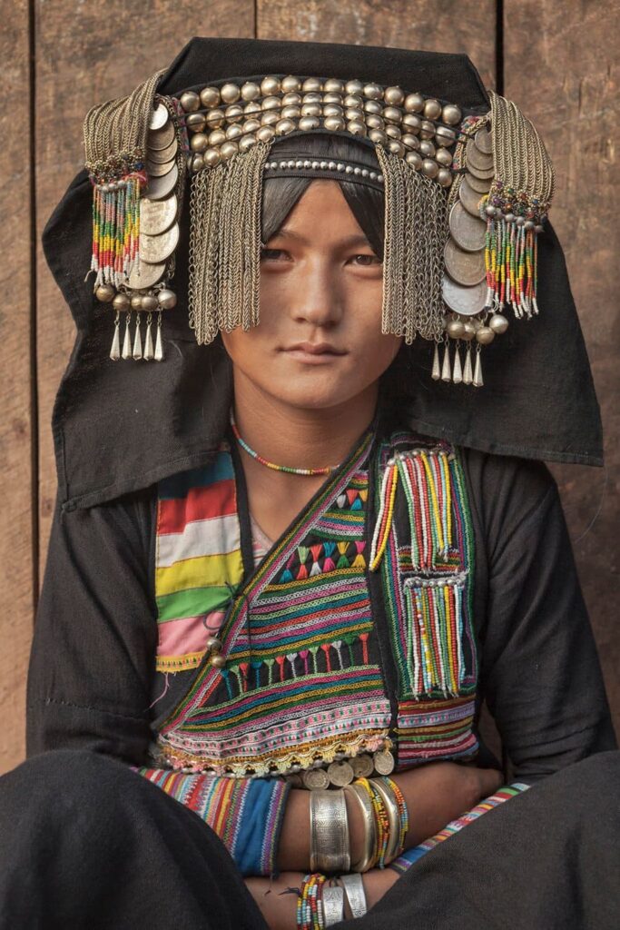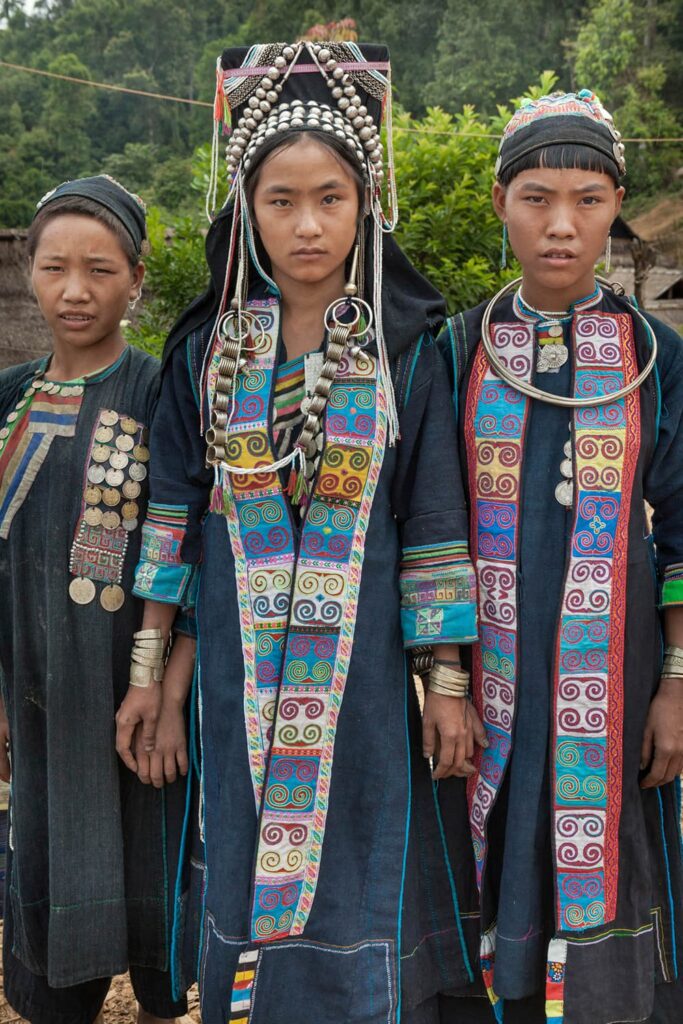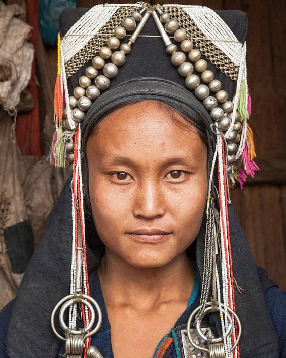 The 20th century saw the Akha people migrate from Yunnan to South East Asia, with the majority settling in Burma. With the Burmese disputes, they then headed to the Golden Triangle. The Akha traditional costume consists of homespun cotton, hand dyed in natural indigo. What really sets them apart is their flamboyant headdress.